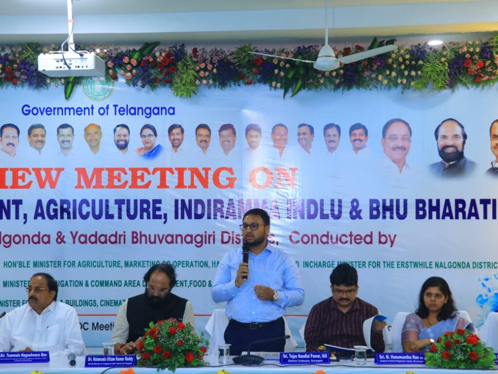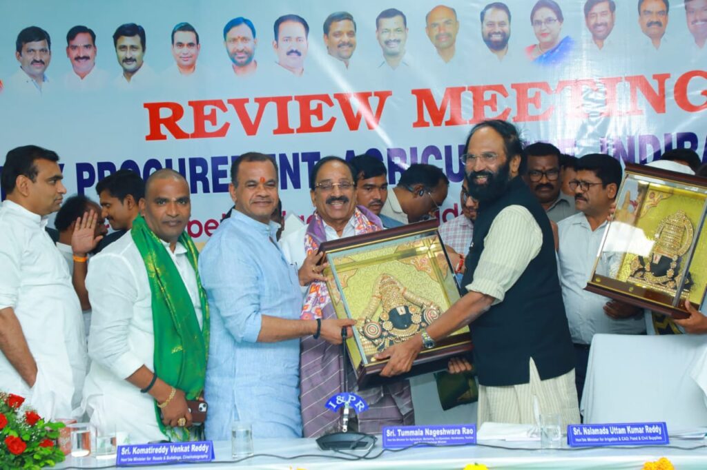 రాష్ట్ర నీటి పారుదల, పౌరసరఫరాల శాఖ మంత్రి ఉత్తమ్ కుమార్ రెడ్డి మాట్లాడుతూ ఉమ్మడి నల్గొండ జిల్లాలో ఈ సంవత్సరం అత్యధికంగా ధాన్యం సేకరణ చేయడం పట్ల జిల్లా కలెక్టర్లను ప్రత్యేకించి నల్గొండ జిల్లా కలెక్టర్ ఇలా త్రిపాఠిని అభినందించారు. వచ్చే సీజన్ నుండి అన్ని కొనుగోలు కేంద్రాలకు ధాన్యాన్ని శుభ్రపరిచే యంత్రాలు , ధాన్యం ఆరబెట్టే యంత్రాలను ఇస్తామని, ప్రతి ధాన్యం కొనుగోలు కేంద్రం లో వీటిని ఏర్పాటు చేస్తామని తెలిపారు. ఉమ్మడి ఆంధ్రప్రదేశ్లో సాధించలేని విధంగా దాన్యం సేకరణ తెలంగాణ రాష్ట్రంలో చేయడం జరిగిందని, మే 29,2023 నాటికి రాష్ట్రంలో యాసంగిలో కేవలం 47 లక్షల మెట్రిక్ టన్నుల వరి ధాన్యాన్నీ కొంటె, ఈ సంవత్సరం మే 29 నాటికి 67 లక్షల మెట్రిక్ టన్నులు ధాన్యం కొనుగోలు చేయడం జరిగిందని , గత సంవత్సరంతో పోలిస్తే 20 లక్షల మెట్రిక్ టన్నులు ఎక్కువగా కొన్నామని తెలిపారు. 2023 లో యాసాంగి లో ధాన్యం అమ్మిన రైతులకు 3,600 కోట్ల రూపాయలు చెల్లిస్తే, తమ ప్రభుత్వం ఈ సంవత్సరం 13250 కోట్ల రూపాయలను రైతులకు చెల్లించడం జరిగిందని తెలిపారు. సన్న బియ్యం పై సుమారు 10 వేల కోట్లు ఖర్చు చేస్తున్నామని, గతంలో రెండు కోట్ల 87 లక్షల మందికి పది వేల కోట్ల రూపాయలు ఖర్చు చేసి దొడ్డు బియ్యం అందించగా, 70% అక్రమంగా తరలించబడిందని, తమ ప్రభుత్వం సన్న బియ్యం పండించిన రైతులకు 500 బోనస్ ఇచ్చామని, రేషన్ కార్డు ఉన్న ప్రతి ఒక్కరికి ఆరు కేజీల బియ్యం ఉచితంగా ఇస్తూన్నామని , అడిగిన ప్రతి ఒక్కరికి రేషన్ కార్డు ఇచ్చే విధంగా చర్యలు తీసుకుంటున్నామని, రానున్న రోజుల్లో బియ్యంతో పాటు, ఇతర రేషన్ సరుకులు ఇవ్వనున్నట్లు మంత్రి వెల్లడించారు. రానున్న 5 సంవత్సరాల్లో ఉమ్మడి నల్గొండ జిల్లాలోని అన్ని ఇరిగేషన్ ప్రాజెక్టును పూర్తి చేస్తామని మంత్రి పునరుద్ఘాటించారు. కాలేశ్వరం లేకున్నప్పటికీ ఈ వర్షాకాలం యాసంగి లో రాష్ట్ర వ్యాప్తంగా 2 లక్షల 80 వేల మెట్రిక్ టన్నుల ధాన్యాన్ని పండించి దేశంలోనే తెలంగాణ రాష్ట్రం నెంబర్ వన్ గా నిలిచిందని తెలిపారు. ప్రజాప్రతినిధులను భాగస్వాములను చేసి అన్ని ప్రాజెక్టులకు ఆయకట్టు ప్లాన్ సంసిద్ధంచేసి ముందే ప్రకటిస్తామని, ఎస్సారెస్పీ లో ఒండ్రు మట్టి తొలగించడం తో పాటు, రాష్ట్రంలోని అన్ని ప్రాజెక్టులలో ఒండ్రు మట్టిని తొలగించి ప్రస్తుతం ఉన్న ప్రాజెక్టుల నీటి నిల్వ సామర్థ్యాన్ని పెంపొందించేలా చర్యలు తీసుకుంటామని, గతంలో మొదలు పెట్టిన డబుల్ బెడ్ రూమ్ ఇండ్లను పూర్తిచేస్తామని, నిధులు అవసరమైతే ప్రతిపాదనలు పంపించాలని, ఈ డబల్ బెడ్ రూమ్ ఇళ్ల కి సంబంధించి లబ్ధిదారులను సంబంధిత శాసన సభ్యులు, ఇంచార్జి మంత్రుల ద్వారా ఎంపిక చేయాలని, ఇందిరమ్మ ఇండ్లు, రాజీవ్ యువ వికాసం, తదితర పథకాలకు అర్హులను ఎంపి